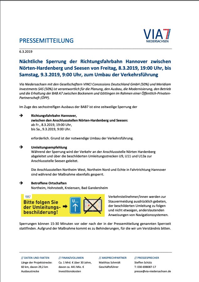 20.02.2019 | Via Niedersachsen informiert über Baumaßnahmen auf der BAB7 im ersten Halbjahr 2019